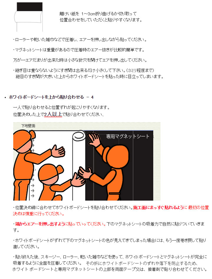 ●ホワイトボードシートは、中間層が鉄粉混練シート構造の為、スチール製のホワイトボードに比べるとマグネットの保持力が劣ります。マグネット留めをされる時はパワーマグネットバーをご使用下さい。